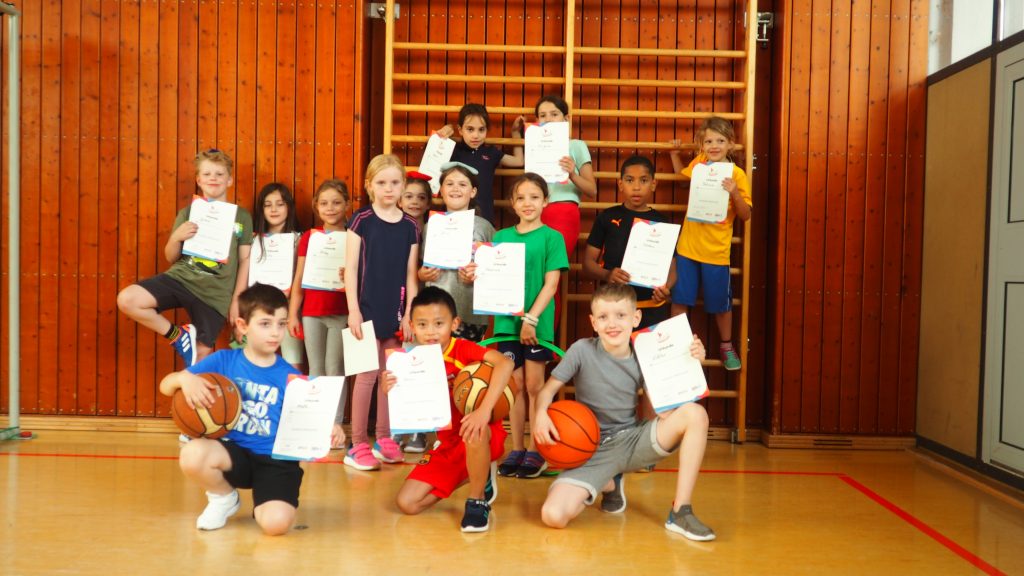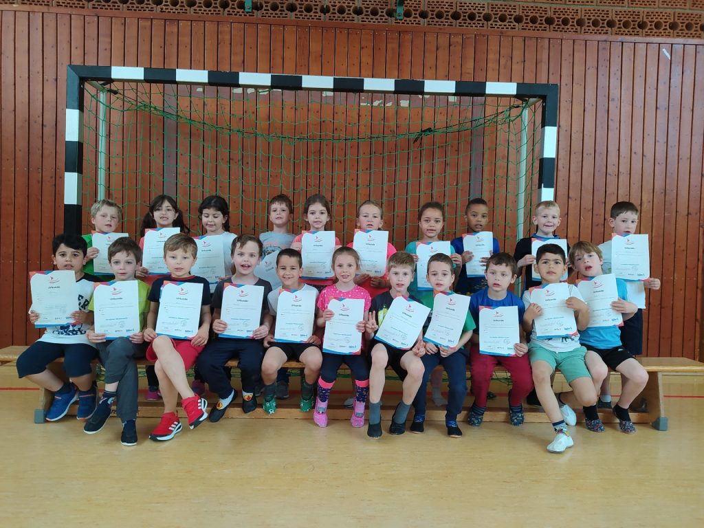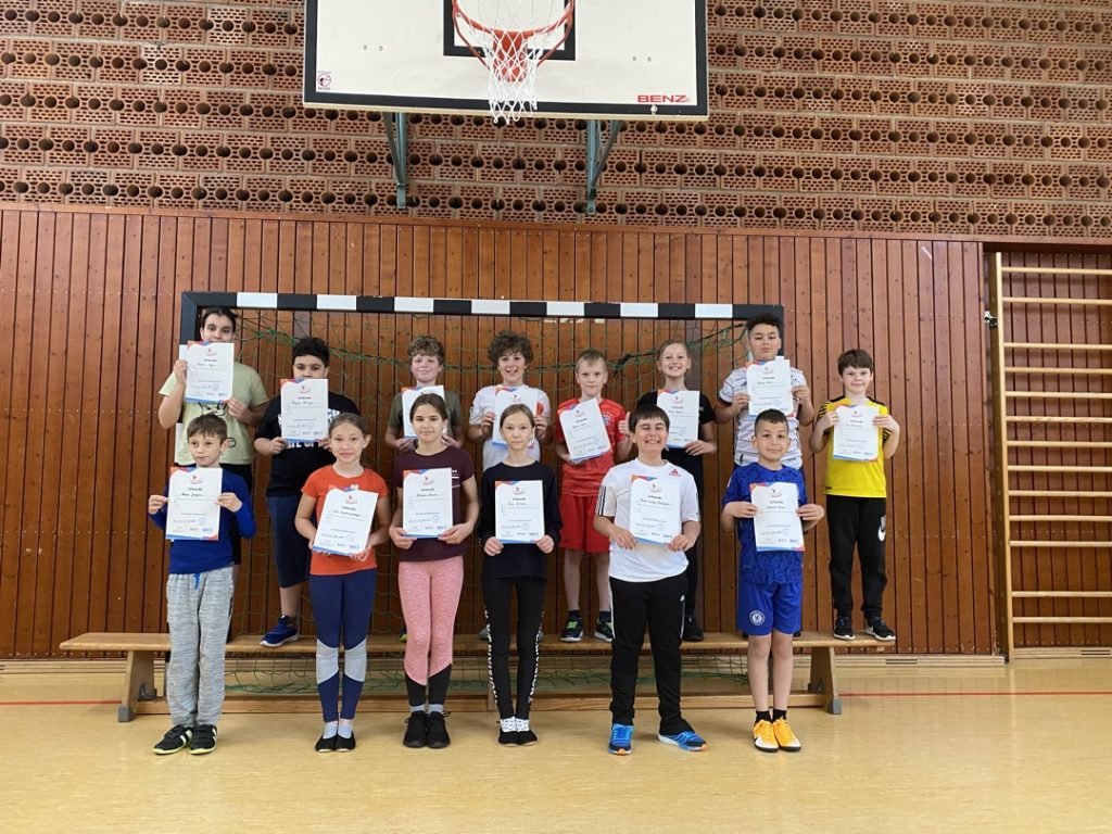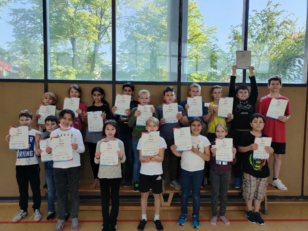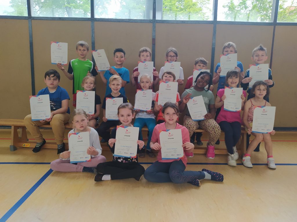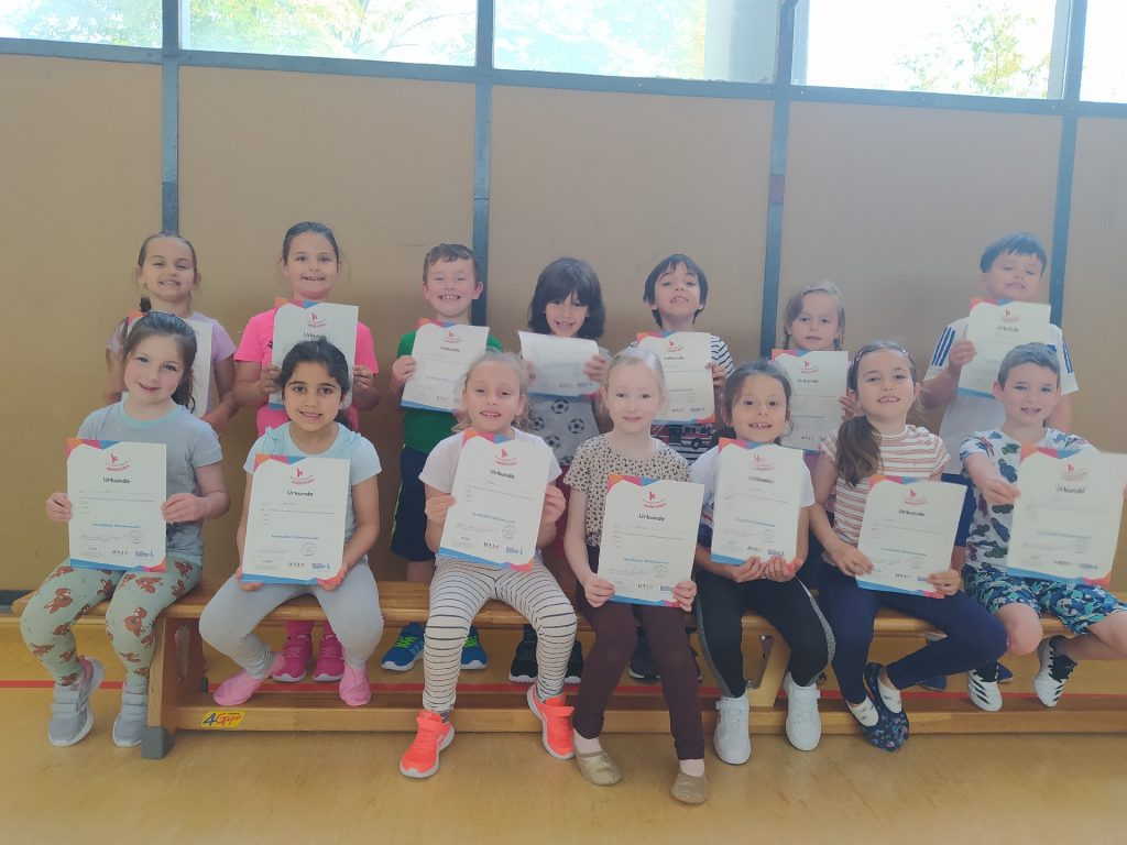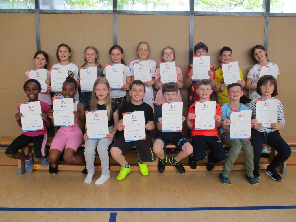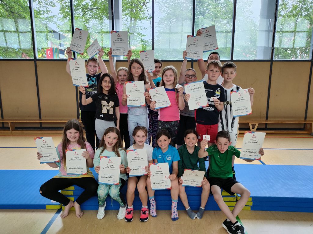 Von Februar bis Mai haben alle Kinder der Grundschule Sundheim für das Kinderturn-Abzeichen trainiert. Es gab sieben verschiedene Fähigkeits- und Fertigkeitsbereiche. Von 42 Übungen mussten mindestens sechs Übungen absolviert werden. Dabei kamen verschiedene Geräte und Materialien zum Einsatz, wie das Trampolin, das Rollbrett, das Schwungtuch, der Barren und noch vieles mehr. Die Kinder hatten viel Spaß. Am Ende gab es die Urkunde in Bronze, Silber oder Gold. Zusätzlich bekam jedes Kind einen Sticker mit dem Kinderturnabzeichen.