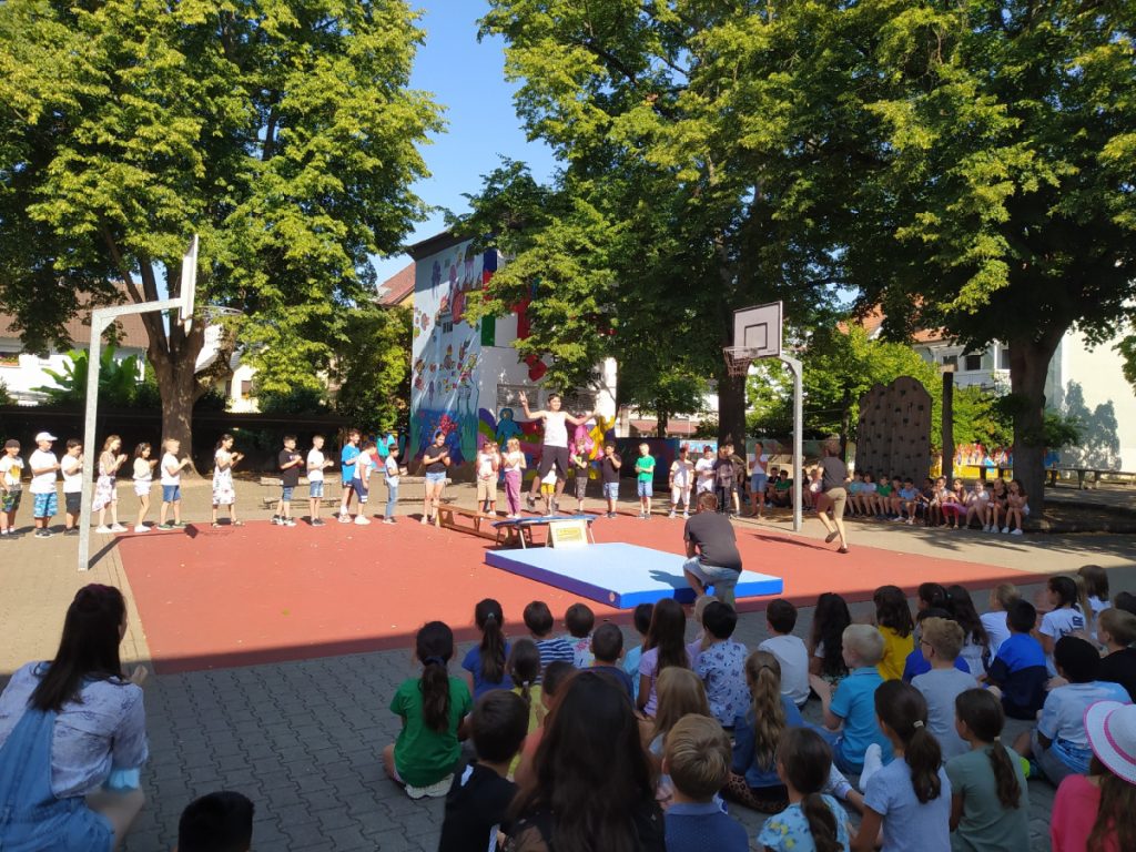Am letzten Schultag verabschiedeten sich die Viertklässler mit einem Programm aus Gesang, Sketchen, Gedichten und sportlichen Einlagen. Die Kinder der anderen Klassen, die zuschauen durften, waren begeistert und der Applaus groß.