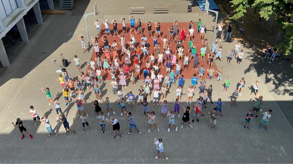 Am Ende tanzten alle Kinder gemeinsam in die Ferien. Zum Lied „Clap your hands“ von Kungs hatten die Kinder mit den Sportlehrern eine Choreographie einstudiert, die dann im Pausenhof gemeinsam getanzt wurde.